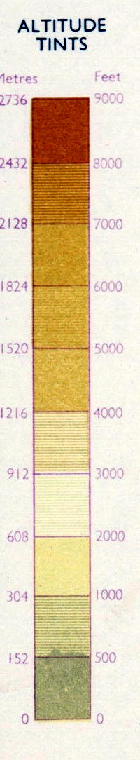 In this case, in order to avoid the confusion as to what color represents which elevation and to avoid misinterpretation of the relief, a layer tint box is usually printed on the map margin to indicate the elevation range represented by each color used on the map.